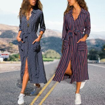Striped Lady Shirt Dress Long Sleeve Turn Down Collar Casual Elegant Midi Dress